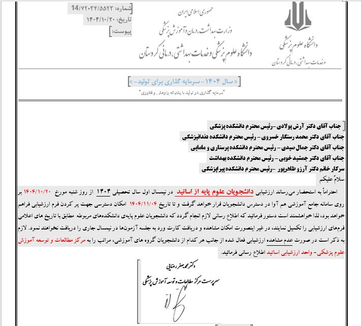 به گزارش روابط عمومی دانشکده پرستاری و مامایی؛ دکتر محمد جعفر رضایی سرپرست مرکز مطالعات و توسعه آموزش پزشکی نحوه ارزشیابی دانشجویان علوم پایه از اساتید را ابلاغ نمودند.